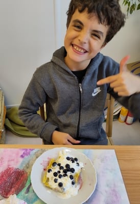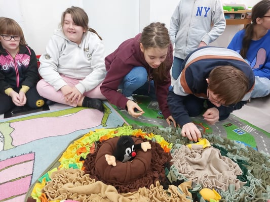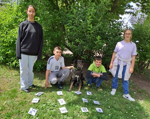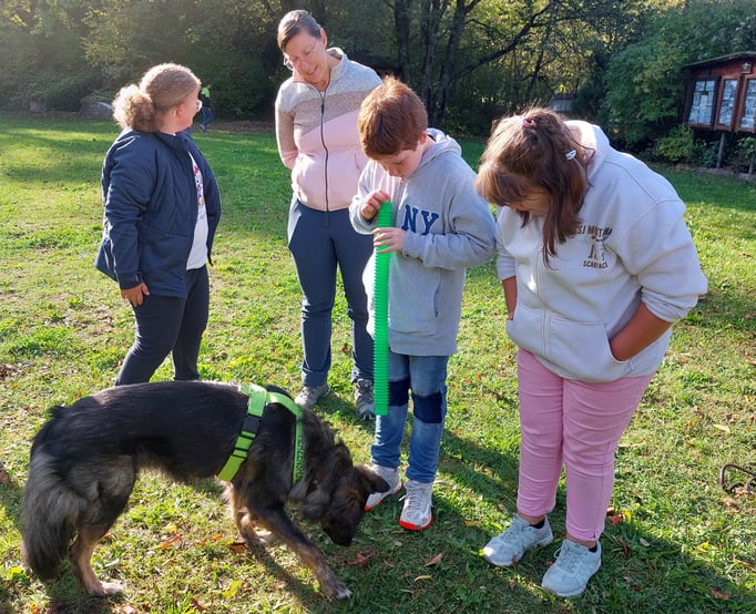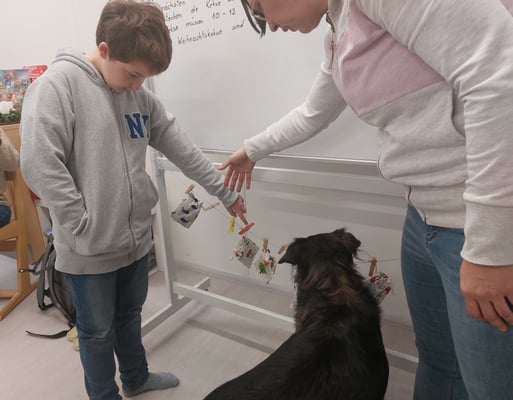 Coffee, unser Therapiebegleithund, spielt mit uns Memory. Besonders Spaß macht es uns, Leckerlis in der Schnüffeldecke zu verstecken.